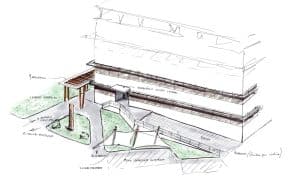 Es clave para la comprensión del proyecto la relación interior-exterior del edificio principal con los bloques exteriores, y como el espacio de transición consigue dotar de vida al conjunto.
