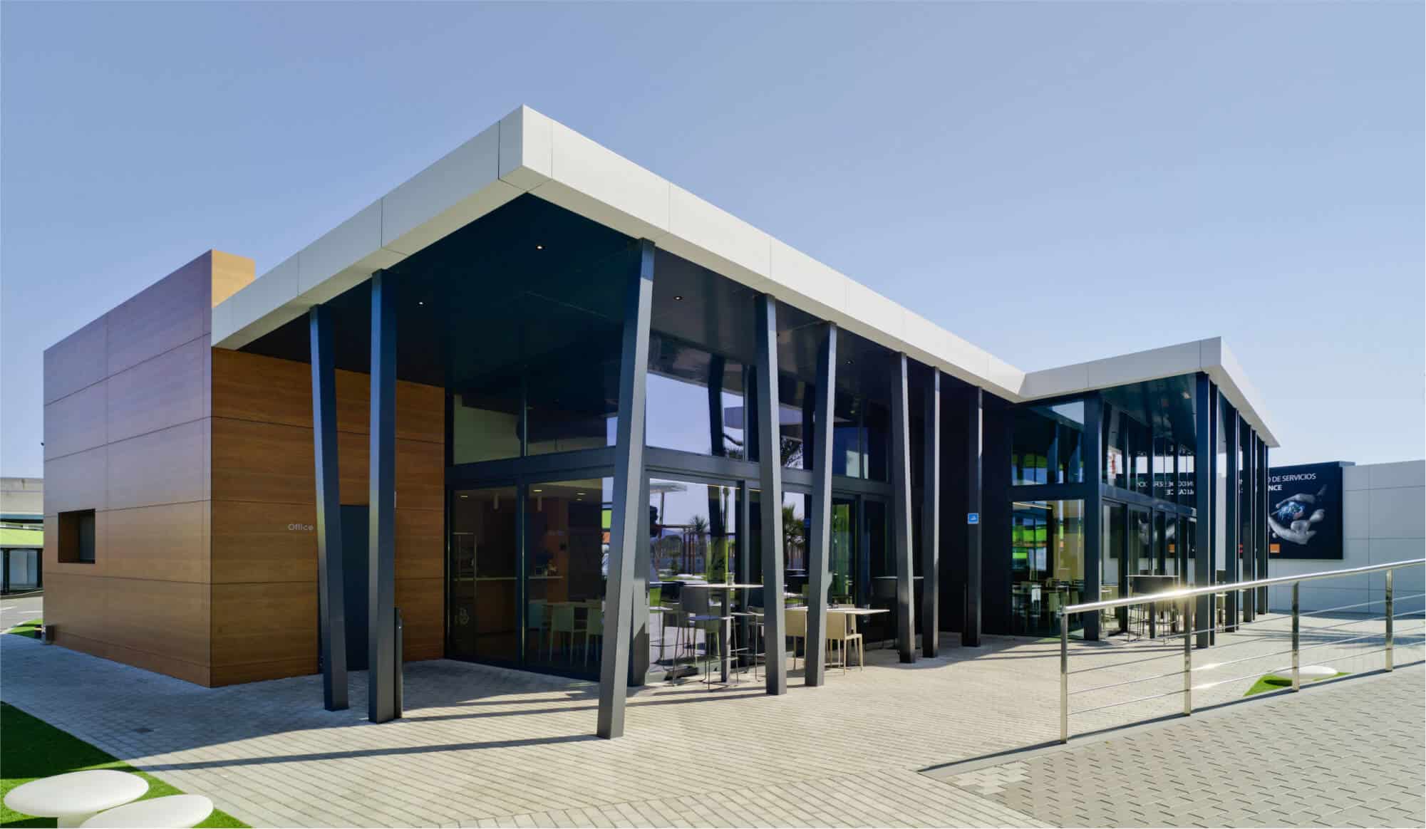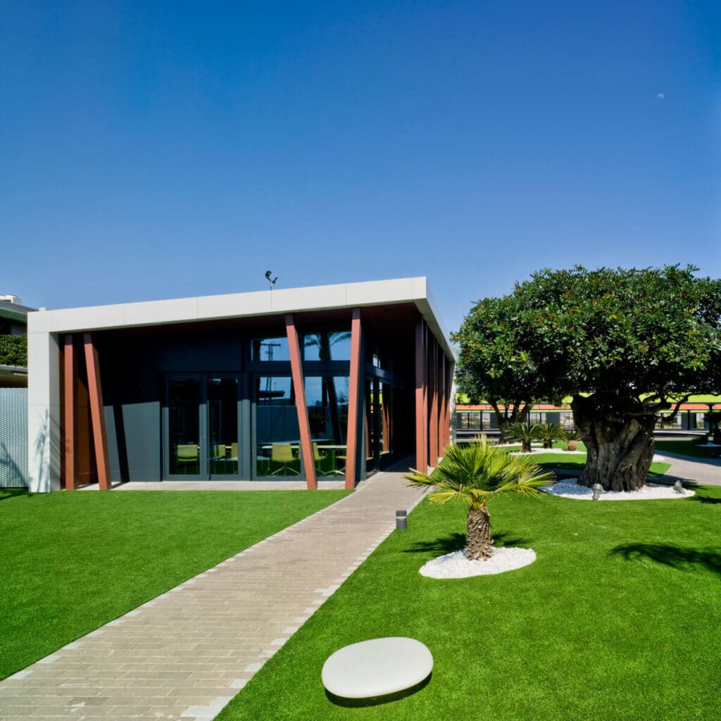 Se nace de un edificio ya construido, el cual se modifica interior y exteriormente para adaptarlo a las necesidades de la empresa, y se añaden 3 nuevos módulos que albergarán salas de conferencias, salas de reuniones y zonas de restauración vinculados al bloque principal mediante un cuidado tratamiento del paisajismo exterior.