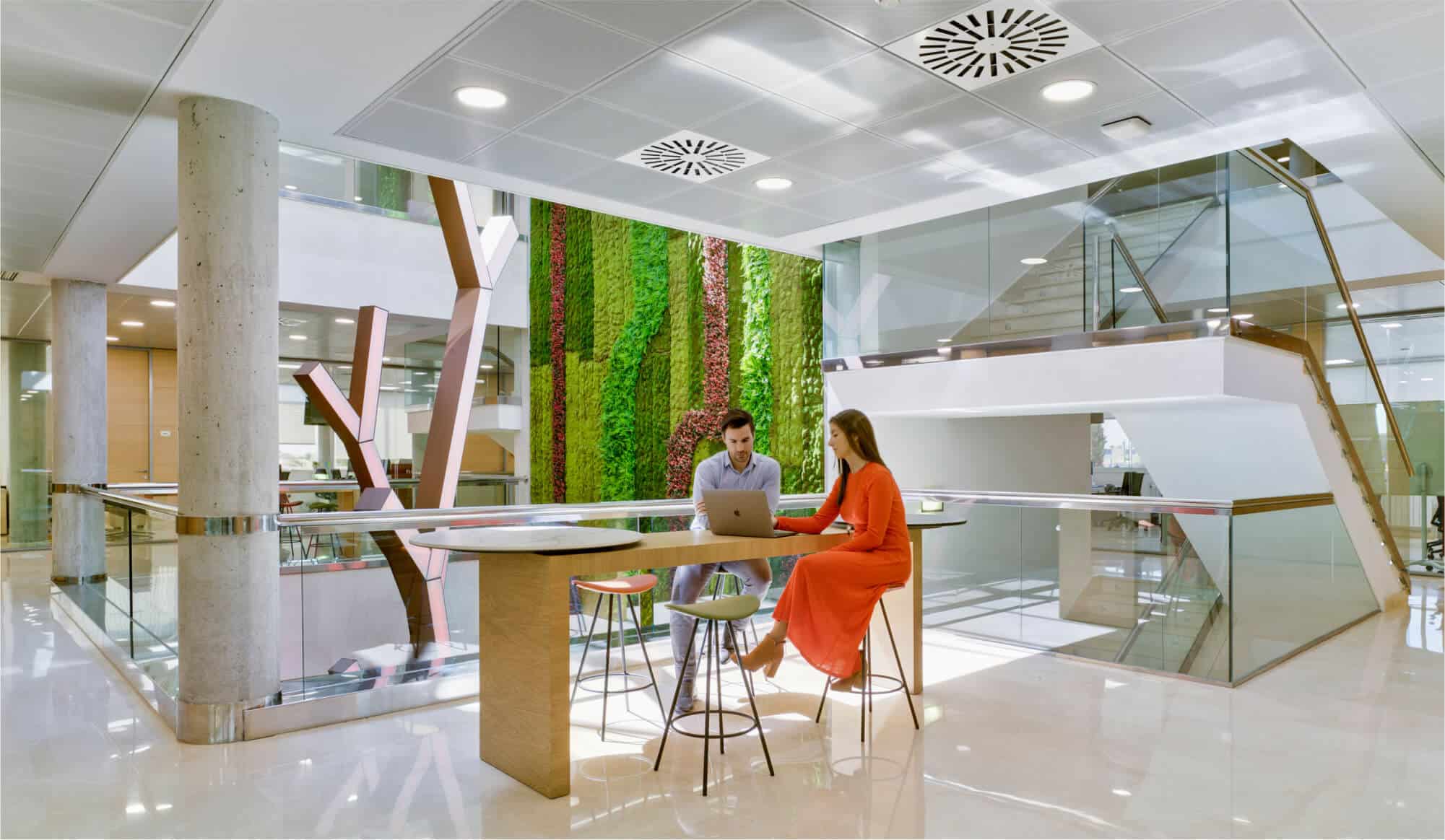 El programa de usos se organiza según bloques y niveles, quedando las zonas comunes, de ocio y públicas en los 3 bloques exteriores. Las zonas destinadas a espacios de trabajo de los diferentes departamentos en planta baja, primera y segunda. Y los usos vinculados a la dirección en planta tercera. Los tres niveles quedan unidos por la triple altura central de un patio interior junto con una gran escultura de acero corten retroiluminada diseñada exclusivamente para este espacio y una zona libre de esparcimiento, reunión o espera, respectivamente.