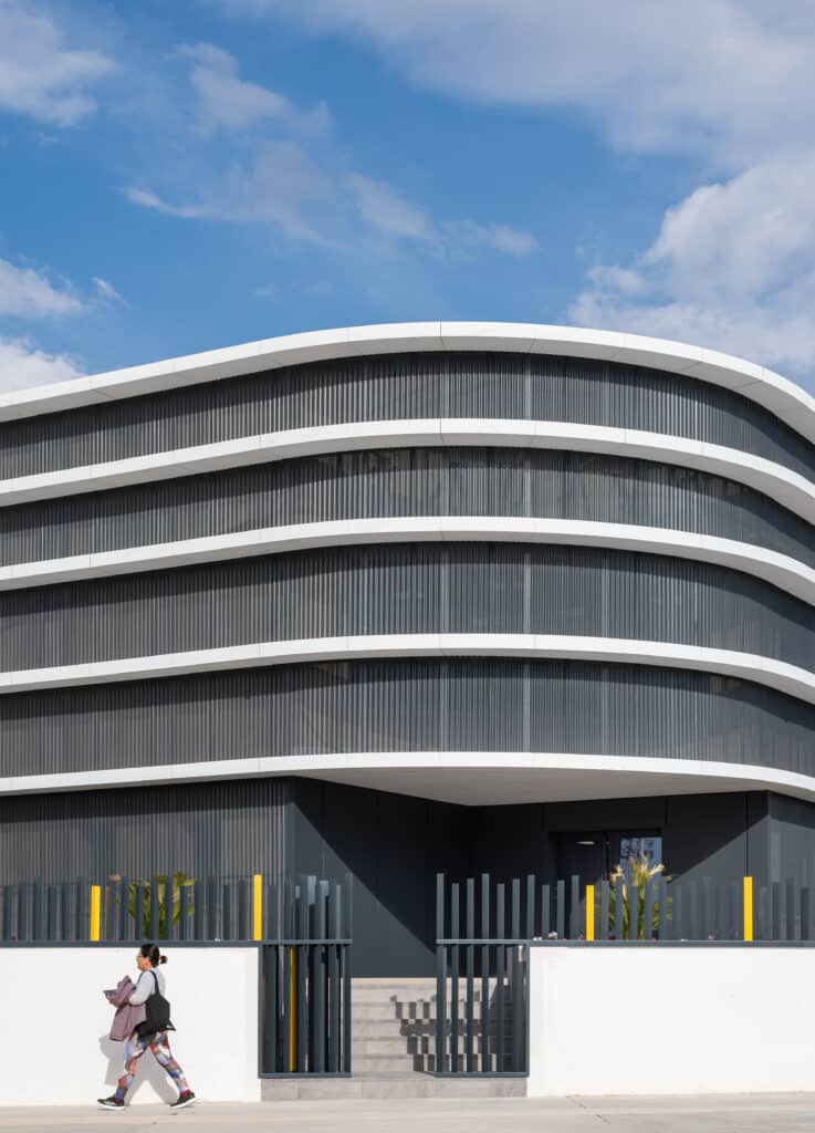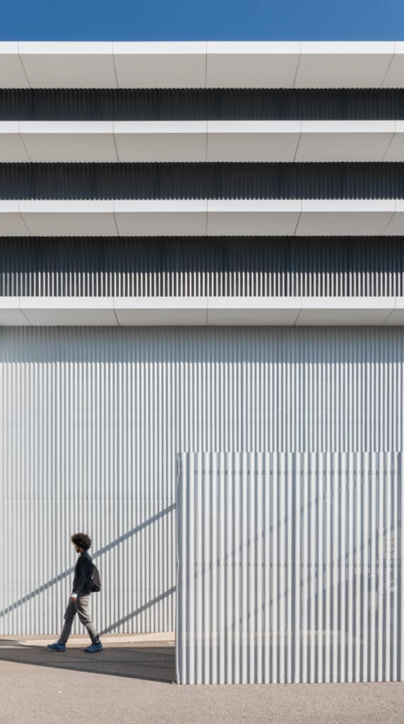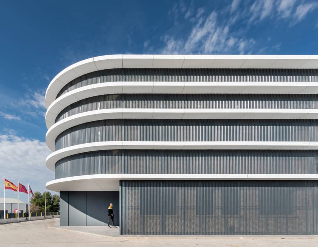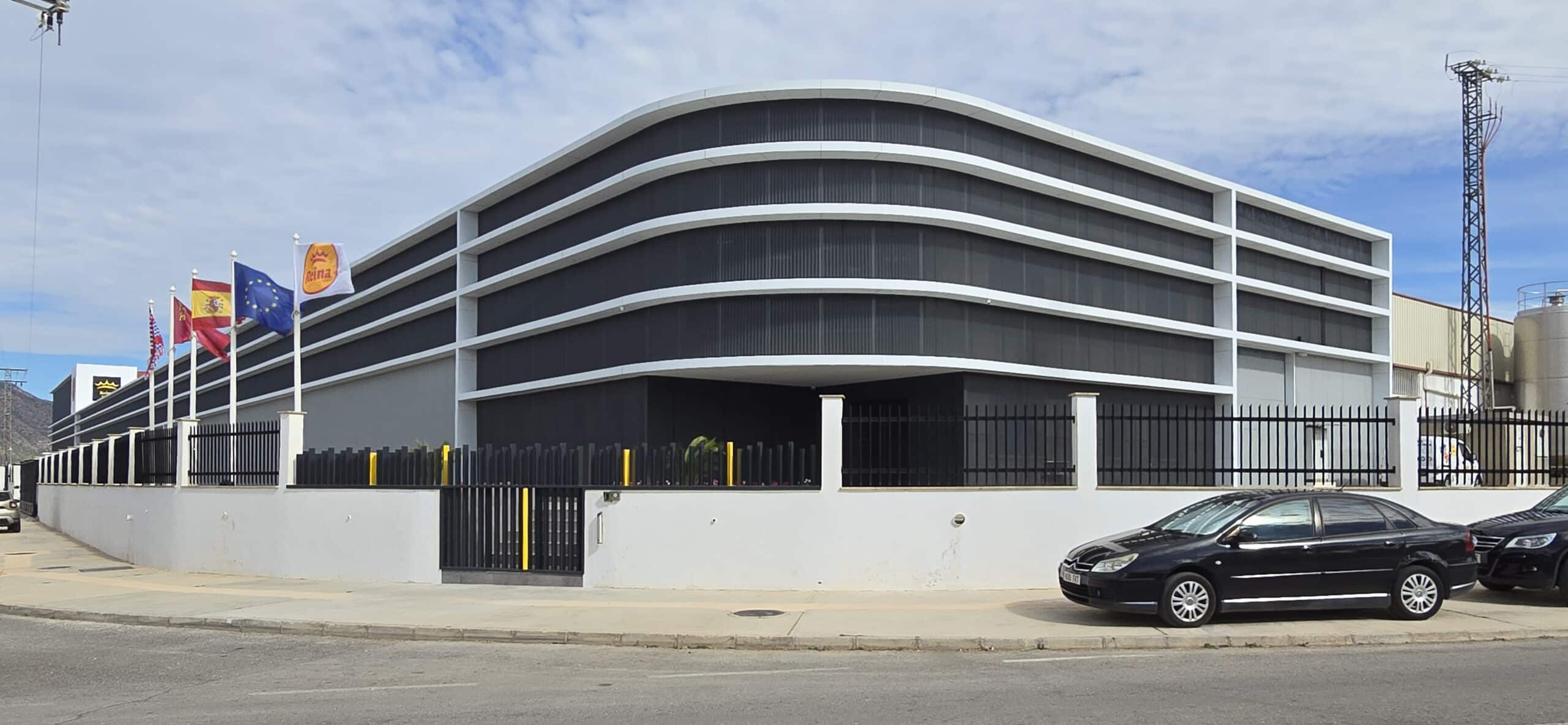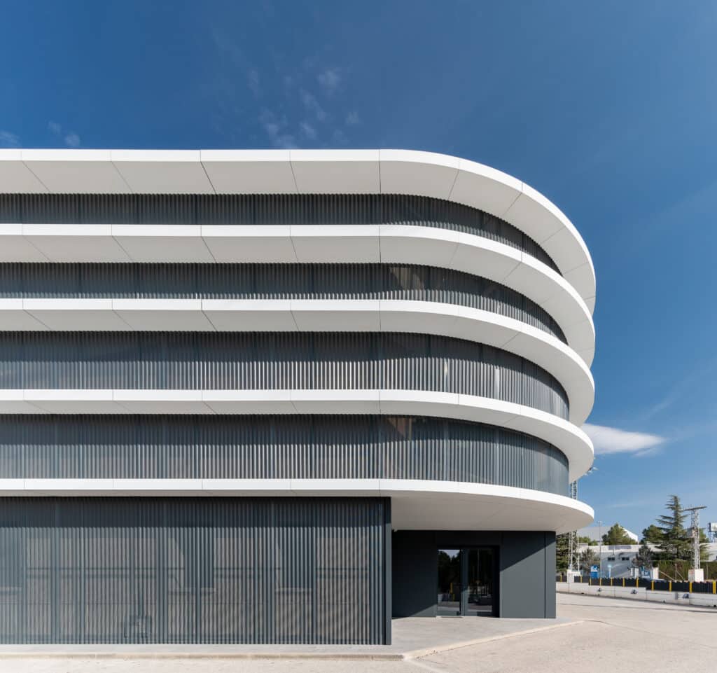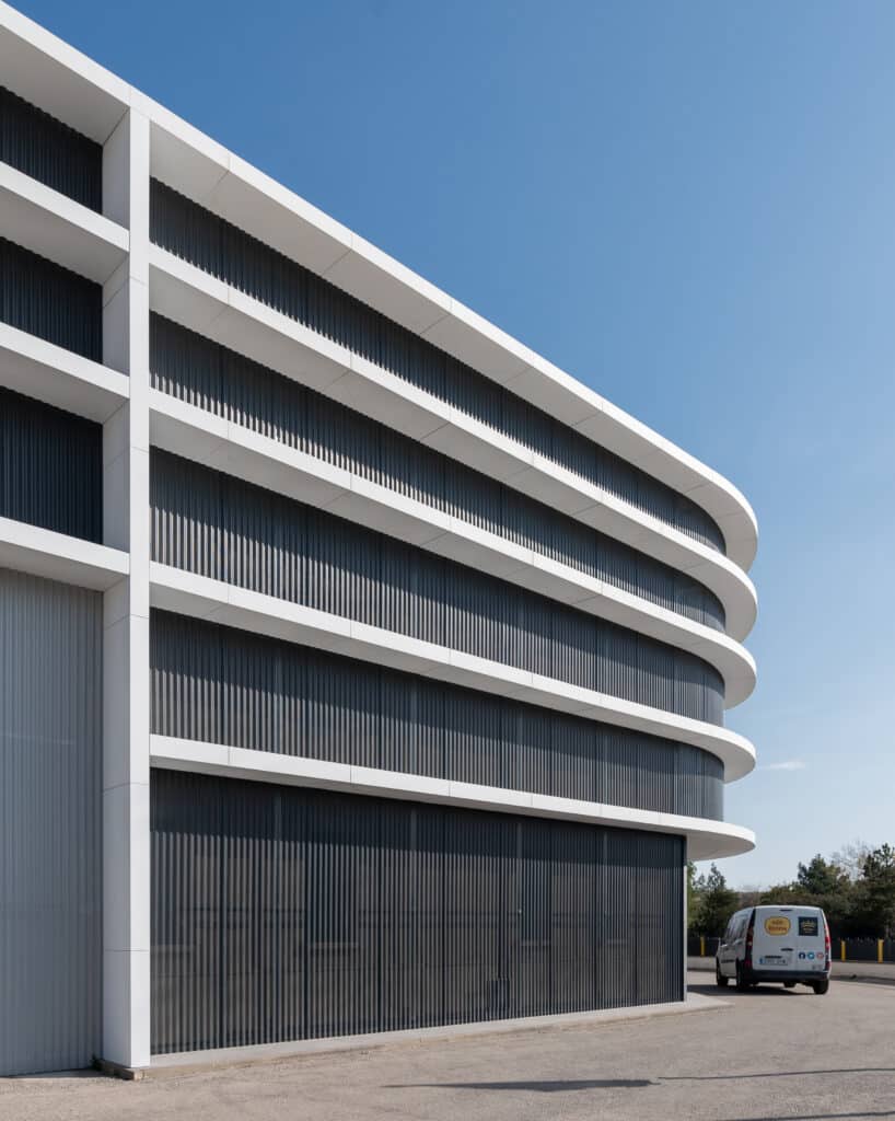 Nos encargamos de diseñar la nueva imagen exterior de una de sus naves mediante unas lamas en voladizo paralelas entre sí formadas de estructuras de aluminio y composite, dando énfasis a la longitudinalidad de la fachada.