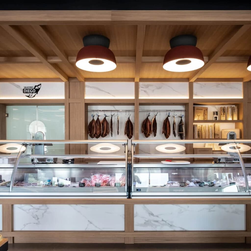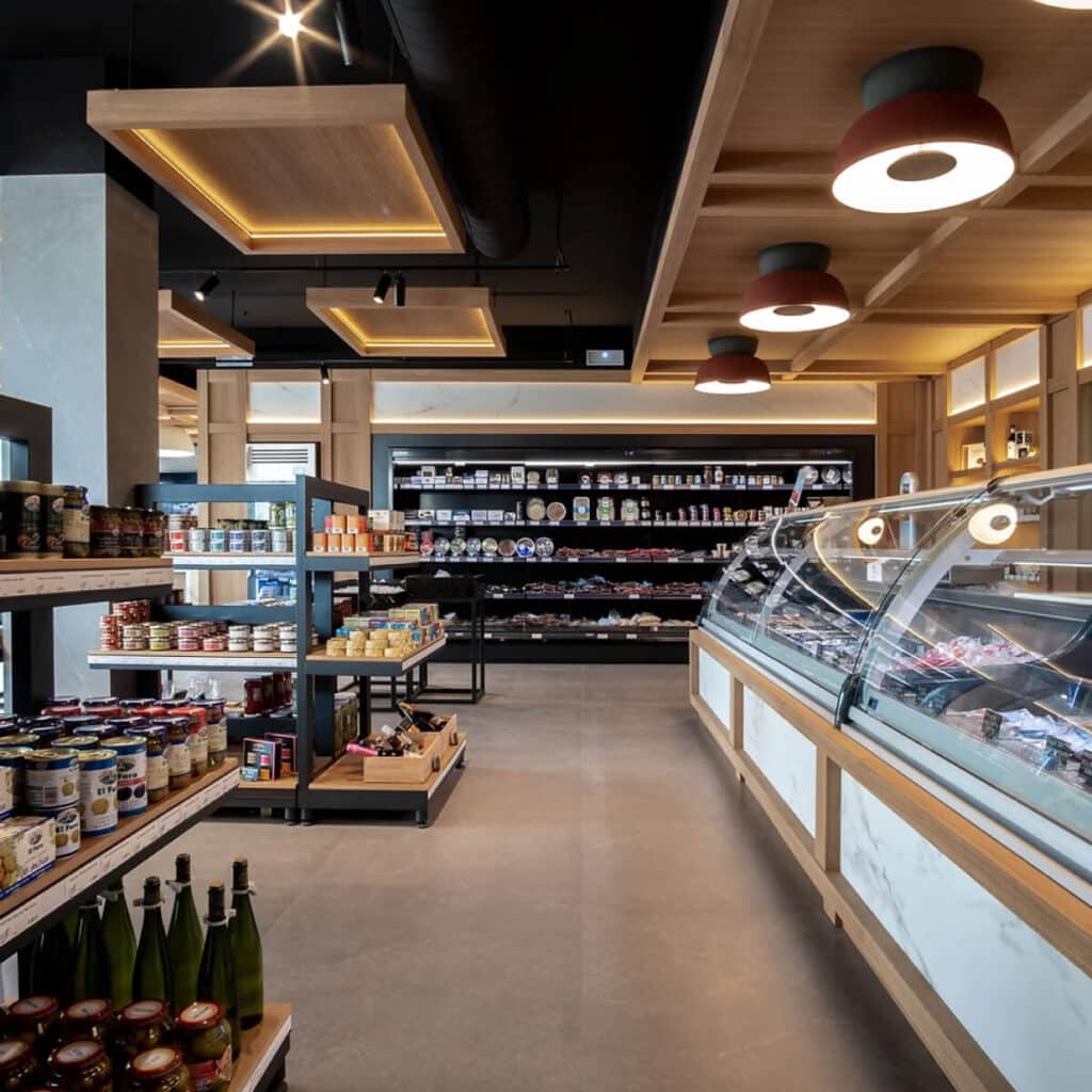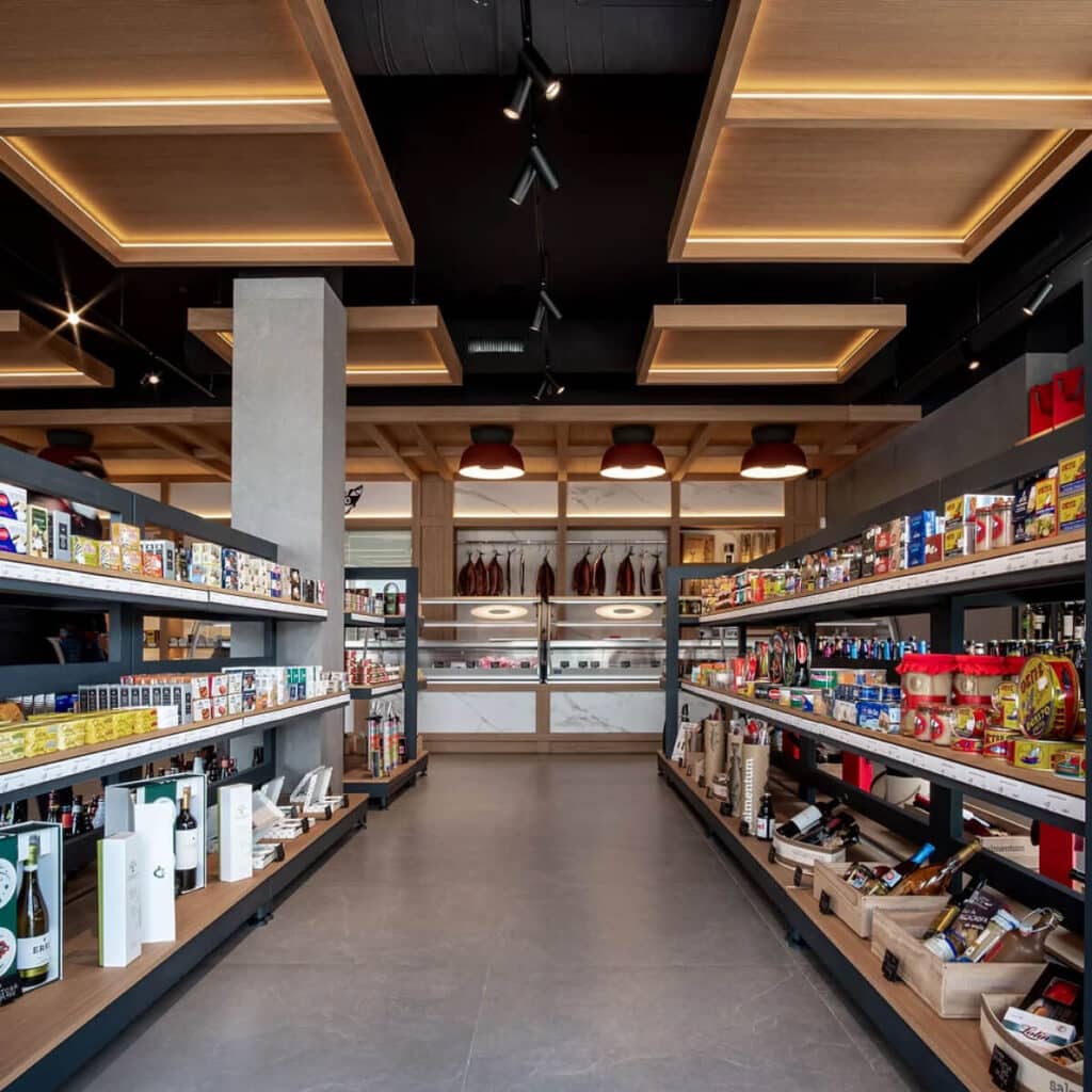 Tanto la iluminación indirecta que baña las estanterías, los proyectores colgados que iluminan los expositores, como los paneles de madera de roble natural ranurado que se suspenden sobre los espacios, sirven para organizar un todo que nos envuelve en un entorno cálido y acogedor sin perder la esencia de comercio del siglo XIX.