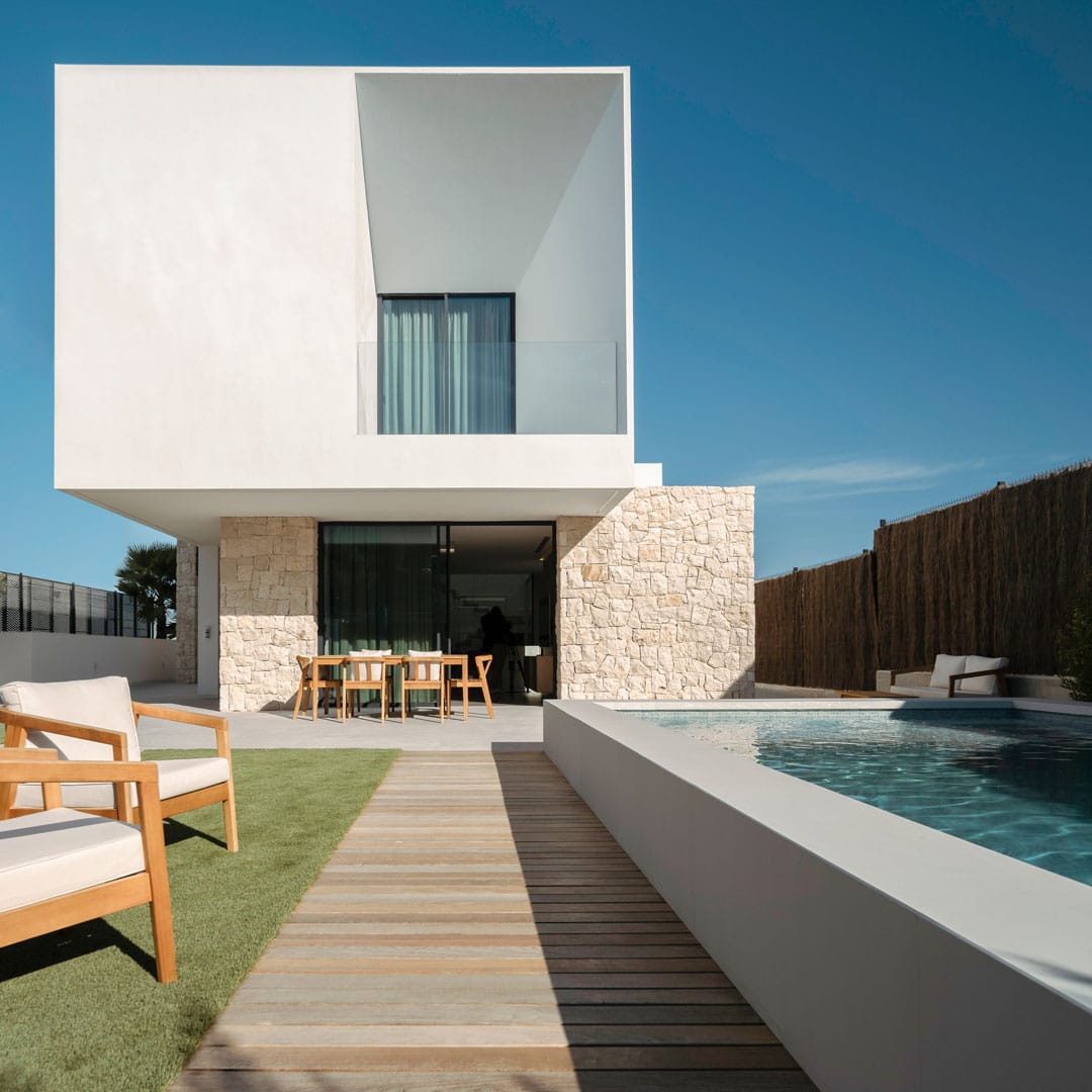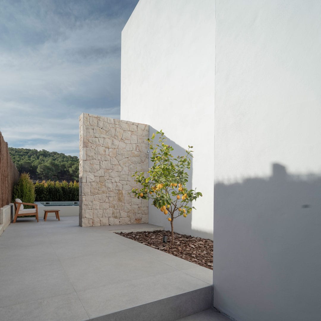 Orientada a sur y de proporción muy alargada, con un marcado eje longitudinal, el principal elemento diferenciador de esta parcela es un gran prisma blanco abierto al bosque en forma de cubo que apoya sobre unos muros de mampostería crema semiajustada