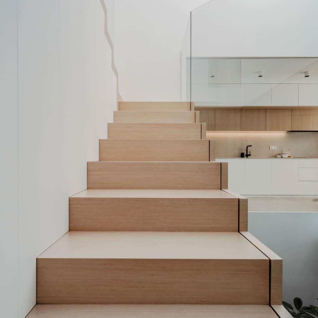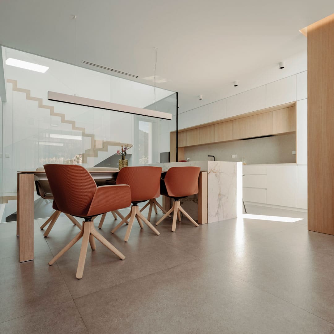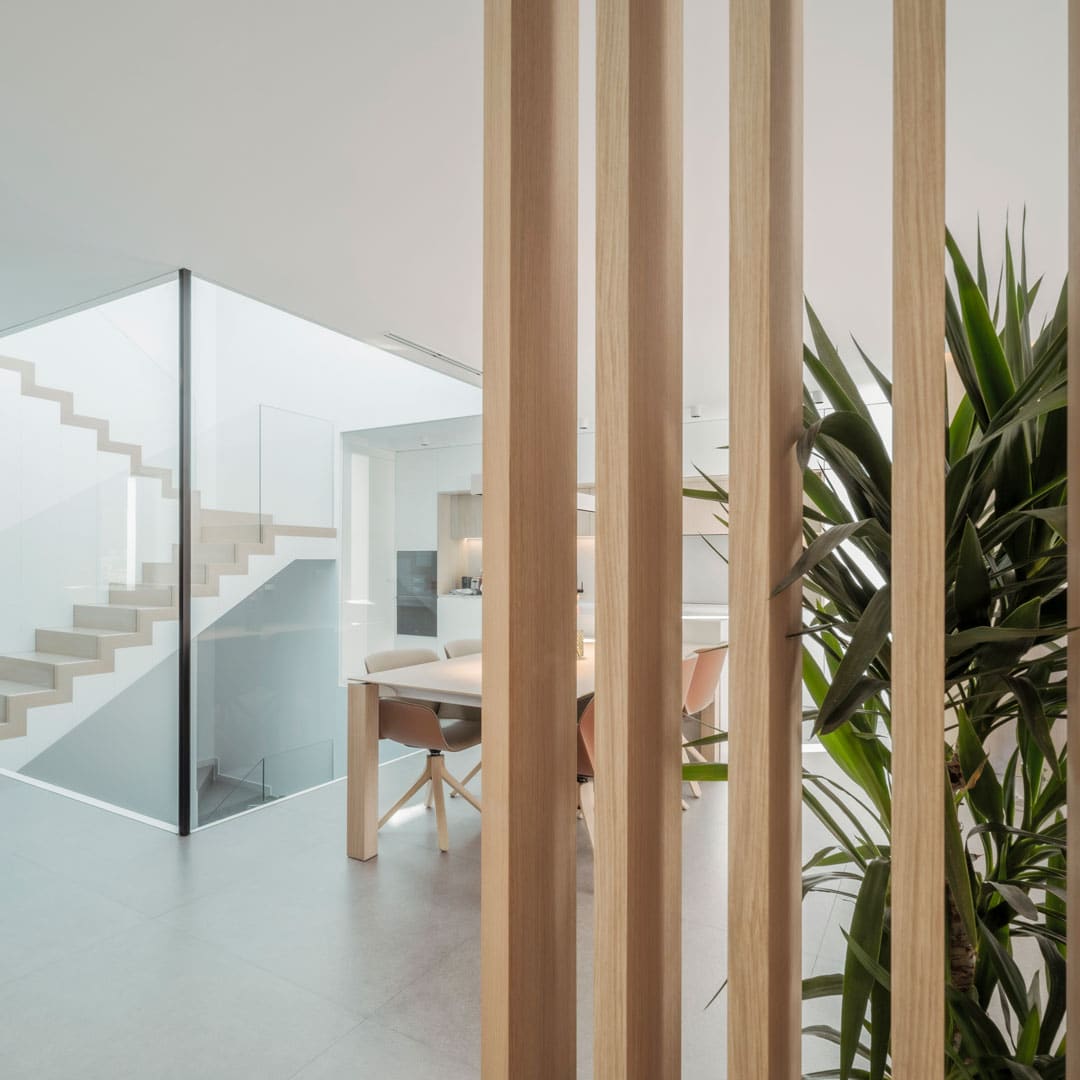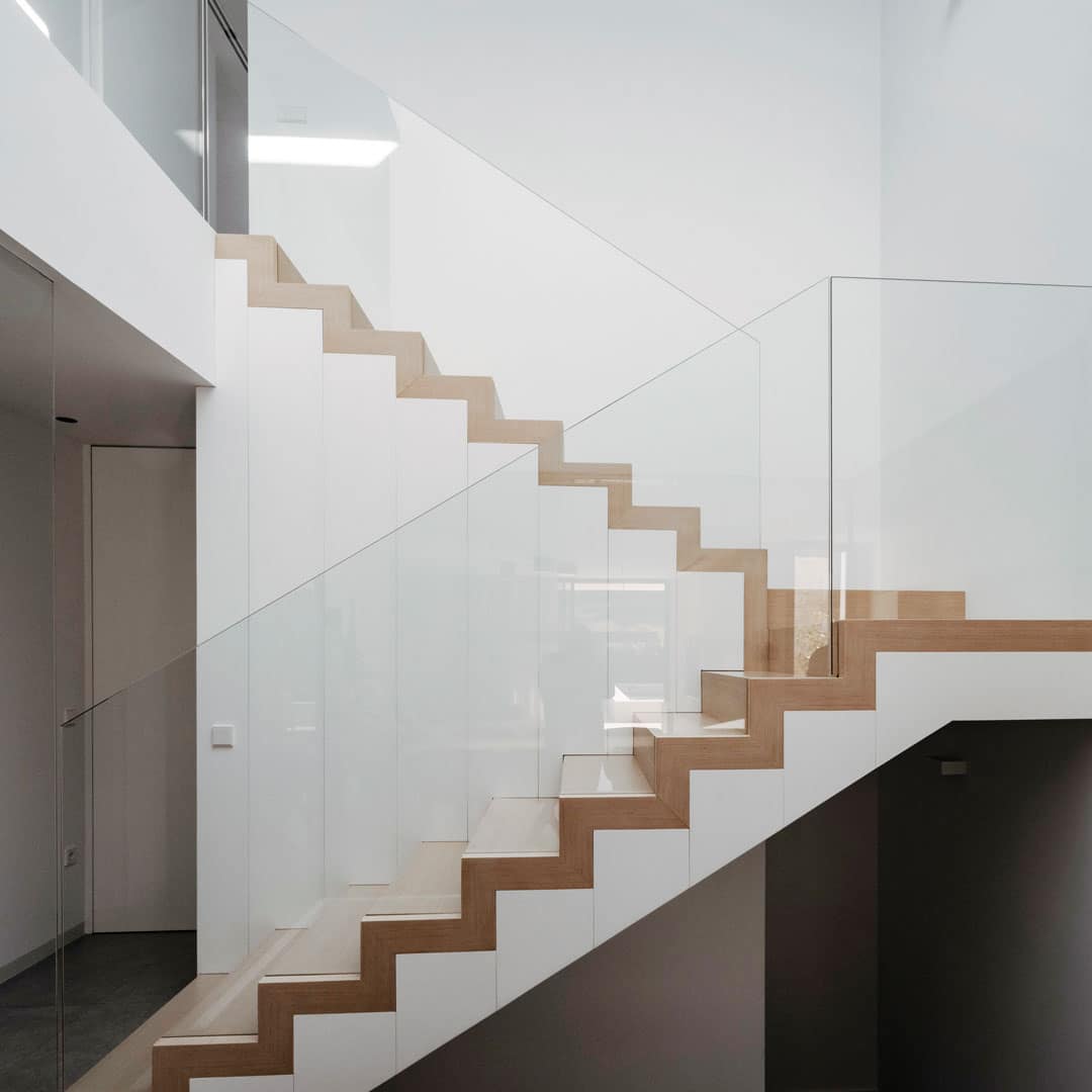 La aparente sencillez del prisma blanco incrementa su complejidad espacial troquelándose en la zona central para permitir la conformación de un gran lucernario que inunda de luminosidad los interiores. La blancura de la pieza principal contrasta con la materialidad pétrea de los volúmenes inferiores y laterales, orientándose para captar unas visuales controladas y privativas. Y en los interiores, entre grandes superficies acristaladas que conectan el bosque con la vivienda, el cálido tacto de la madera natural de roble mallado vertebrando todos estos espacios.