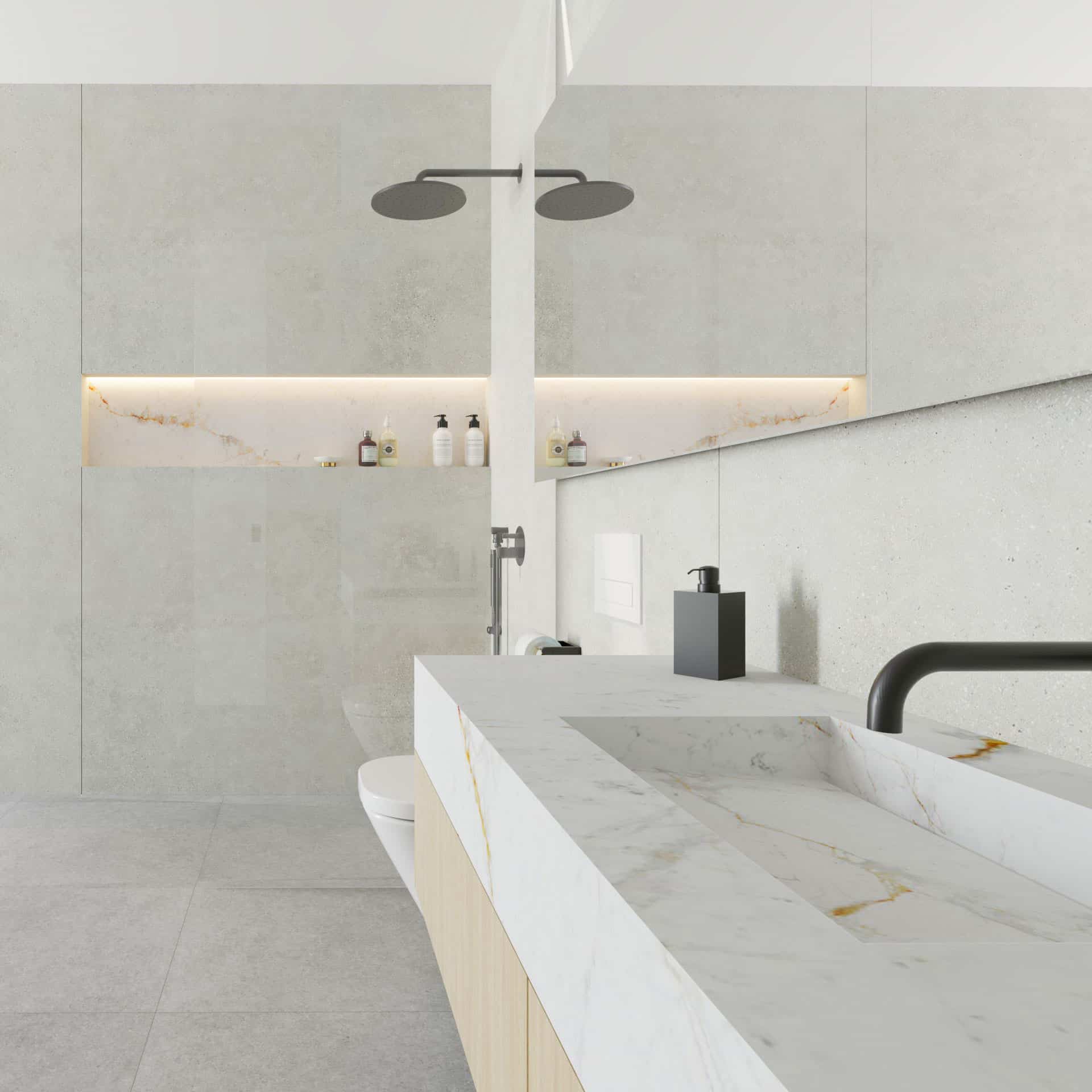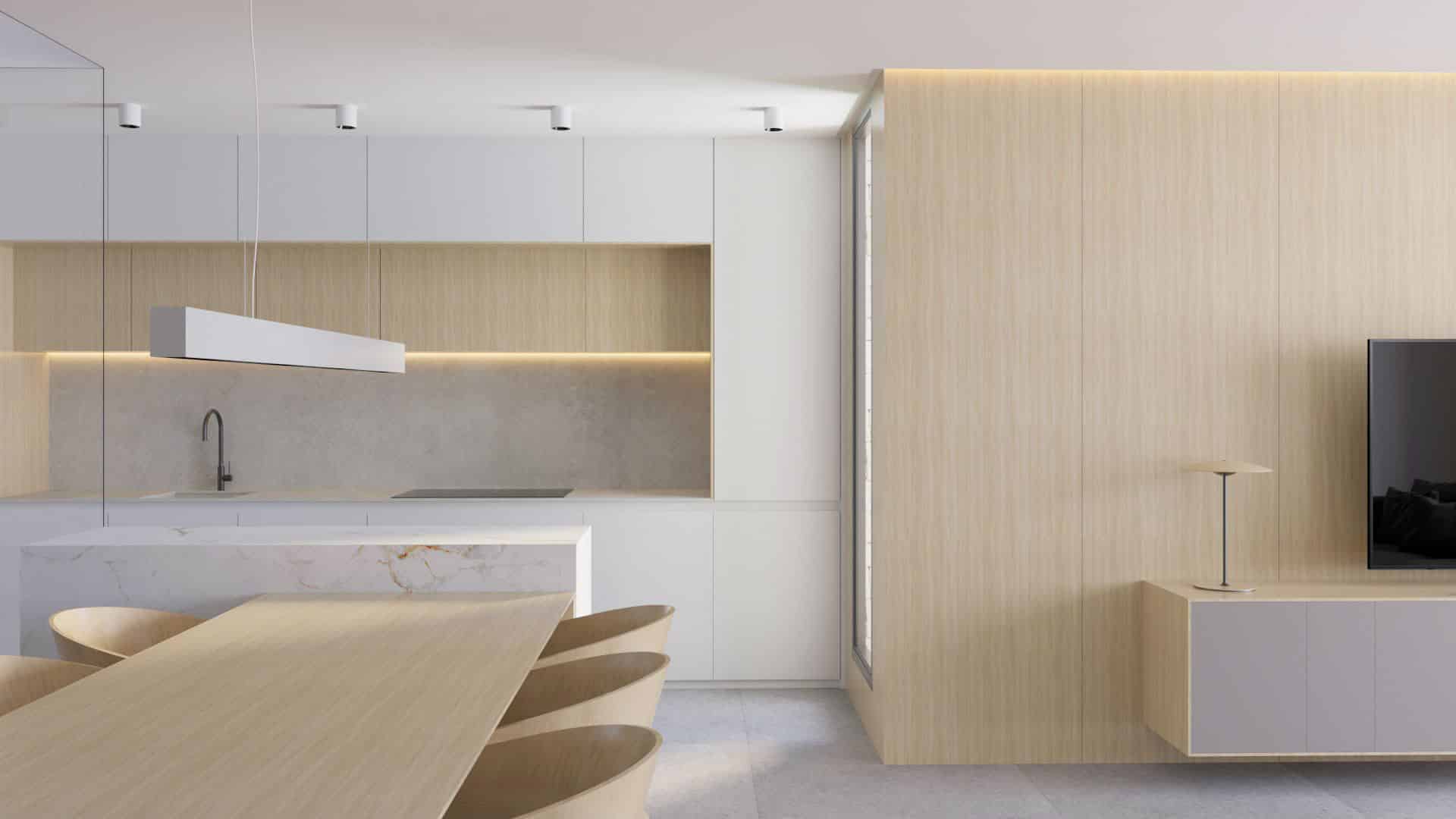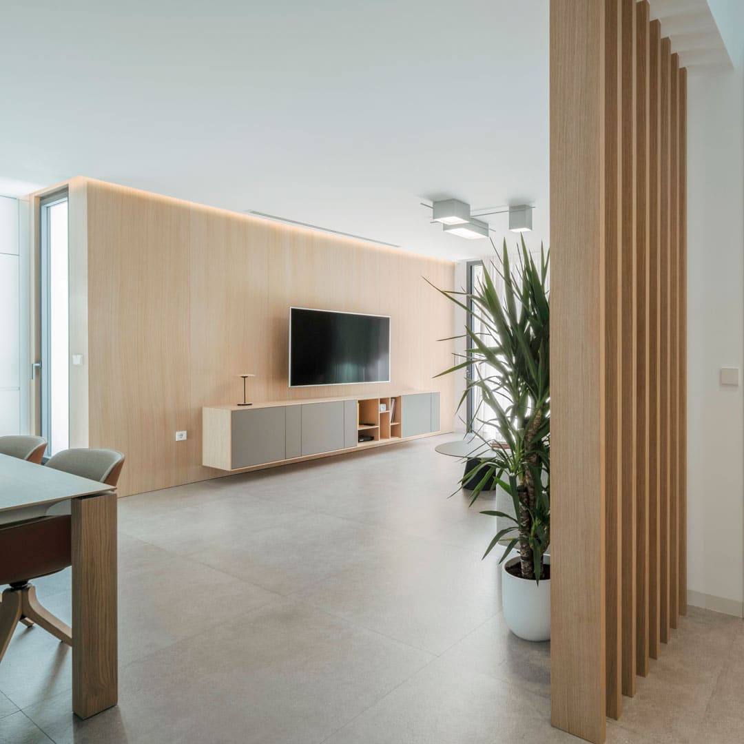 La aparente sencillez del prisma blanco incrementa su complejidad espacial troquelándose en la zona central para permitir la conformación de un gran lucernario que inunda de luminosidad los interiores. La blancura de la pieza principal contrasta con la materialidad pétrea de los volúmenes inferiores y laterales, orientándose para captar unas visuales controladas y privativas. Y en los interiores, entre grandes superficies acristaladas que conectan el bosque con la vivienda, el cálido tacto de la madera natural de roble mallado vertebrando todos estos espacios.