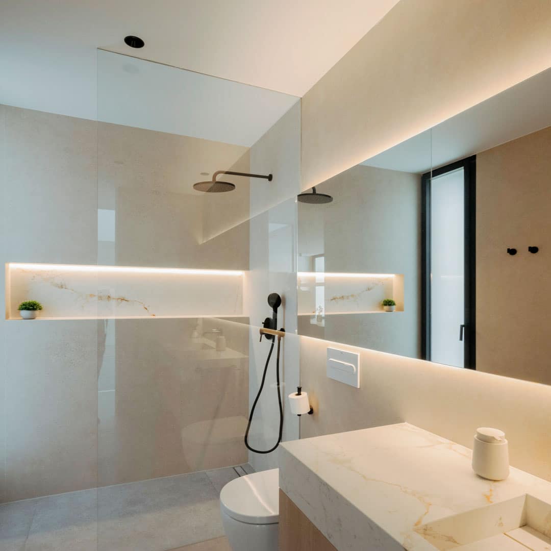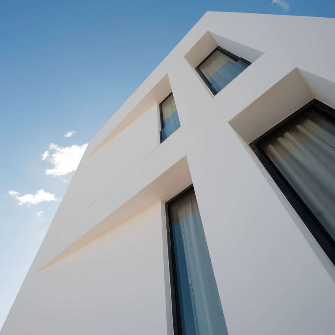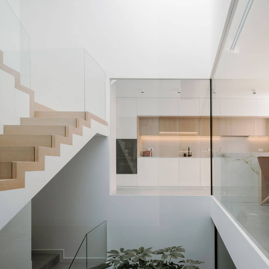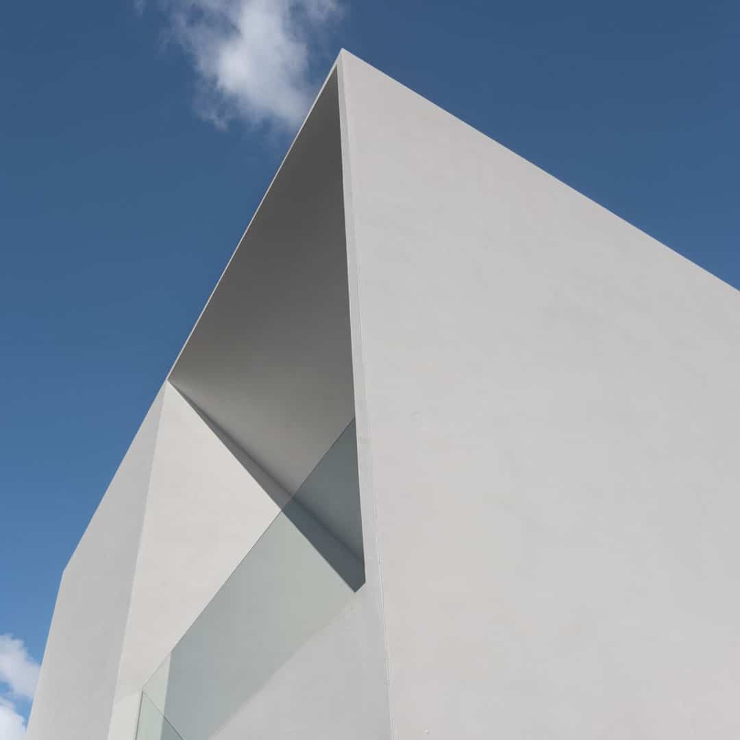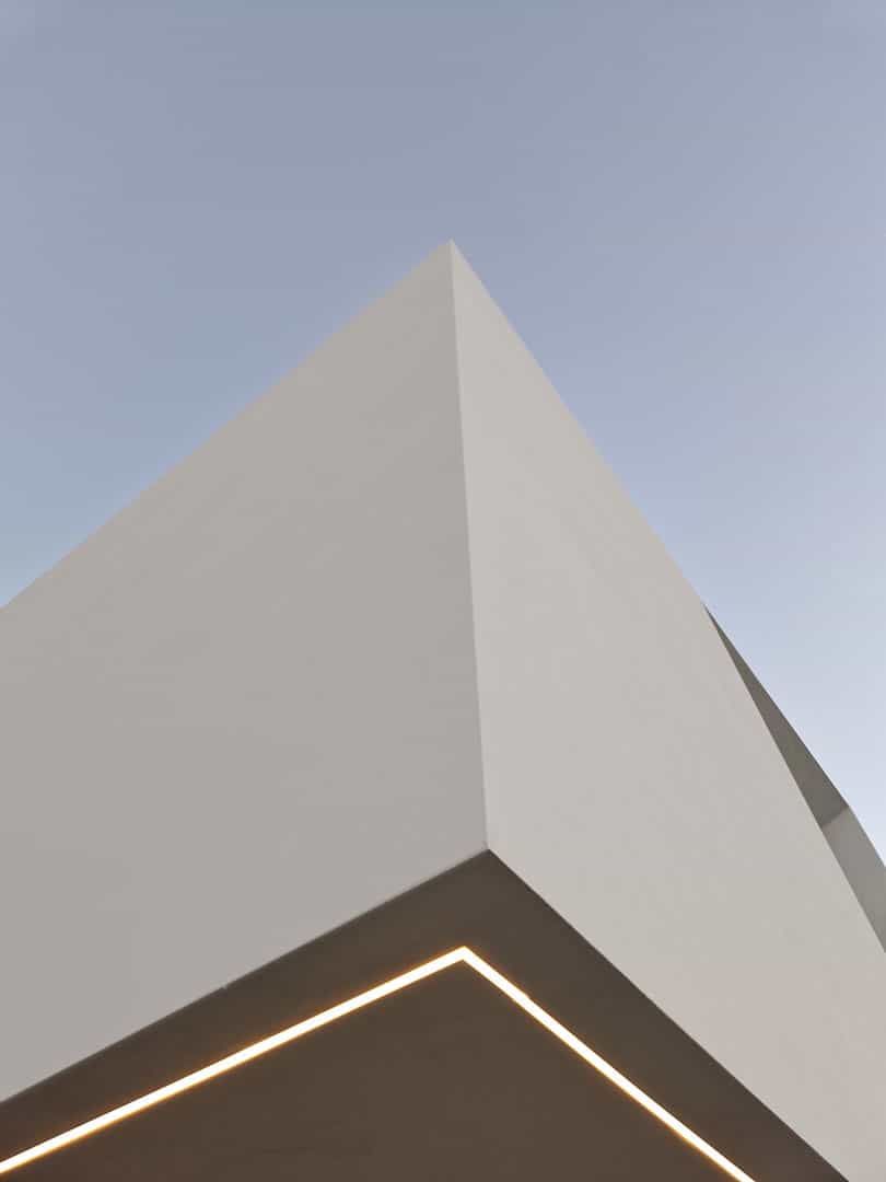La aparente sencillez del prisma blanco incrementa su complejidad espacial troquelándose en la zona central para permitir la conformación de un gran lucernario que inunda de luminosidad los interiores.